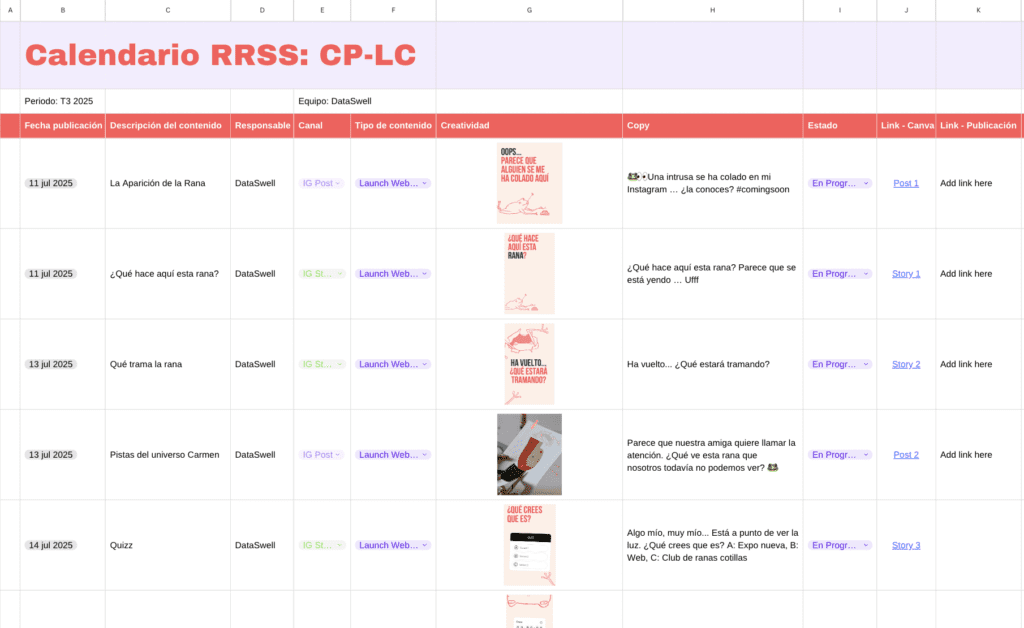 After designing and developing her website, Carmen needed to communicate its launch in a coherent and effective way. Her visual universe is very distinctive, and the challenge was to translate that artistic language into social media while maintaining consistency with the brand book and all the visual work done so far. In addition, Carmen not only wanted to announce her new website but also consolidate her online presence and continue growing on platforms like Instagram.